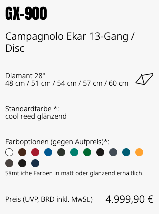 Campagnolo Ekar Schaltgruppe mit 13 Gängen, Columbus Futura Cross Carbon Gabel, Newmen Advanced Carbon Laufräder, superleichte und gravelspezifische Anbauteile der Ritchey WCS Serie, Ritchey Butano Lenker mit geringem Drop und 6° Flare: Allein die Wahl der Komponenten zeigt eindrucksvoll, auf welchem Niveau das GX-900 „unterwegs zuhause“ ist.